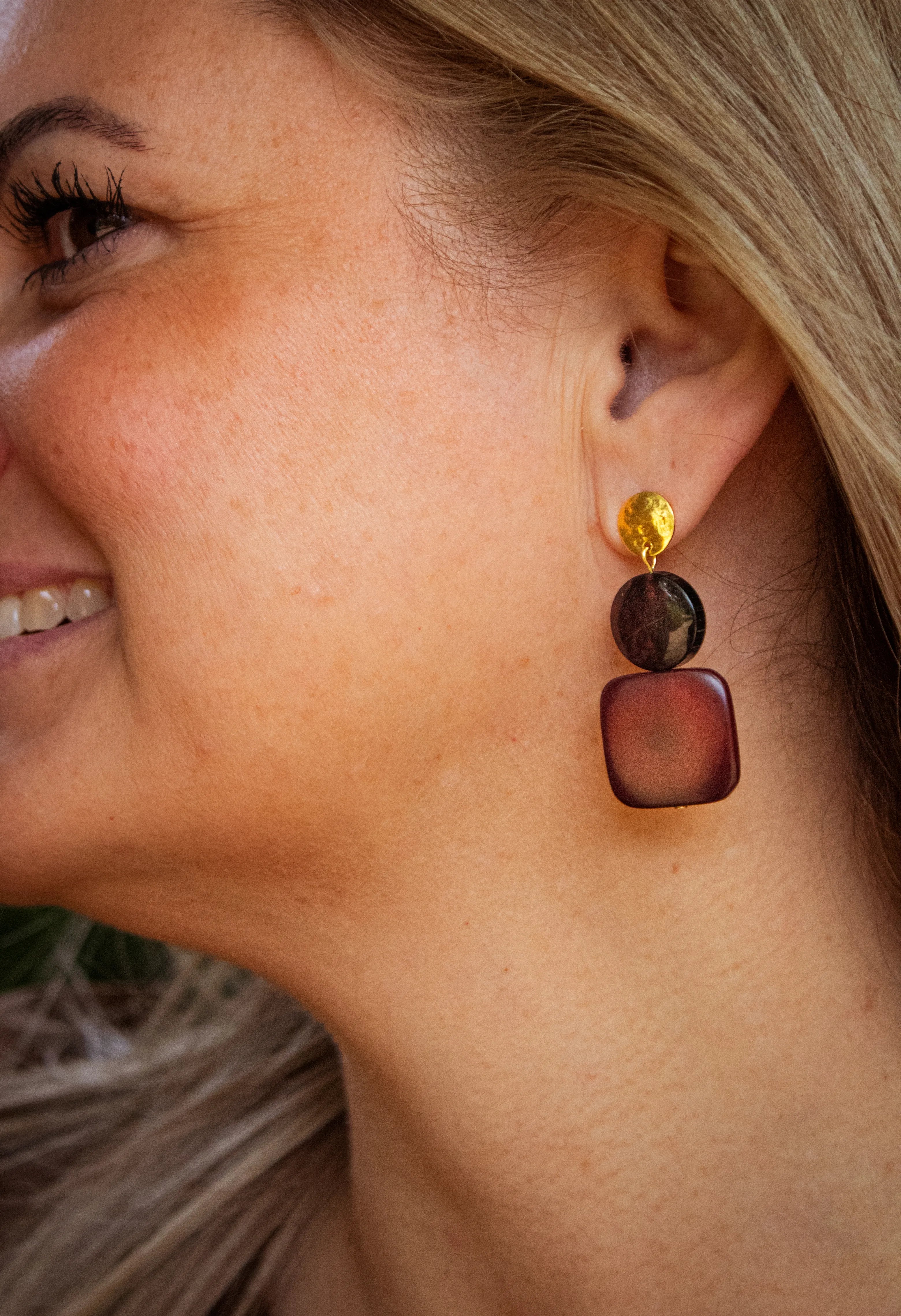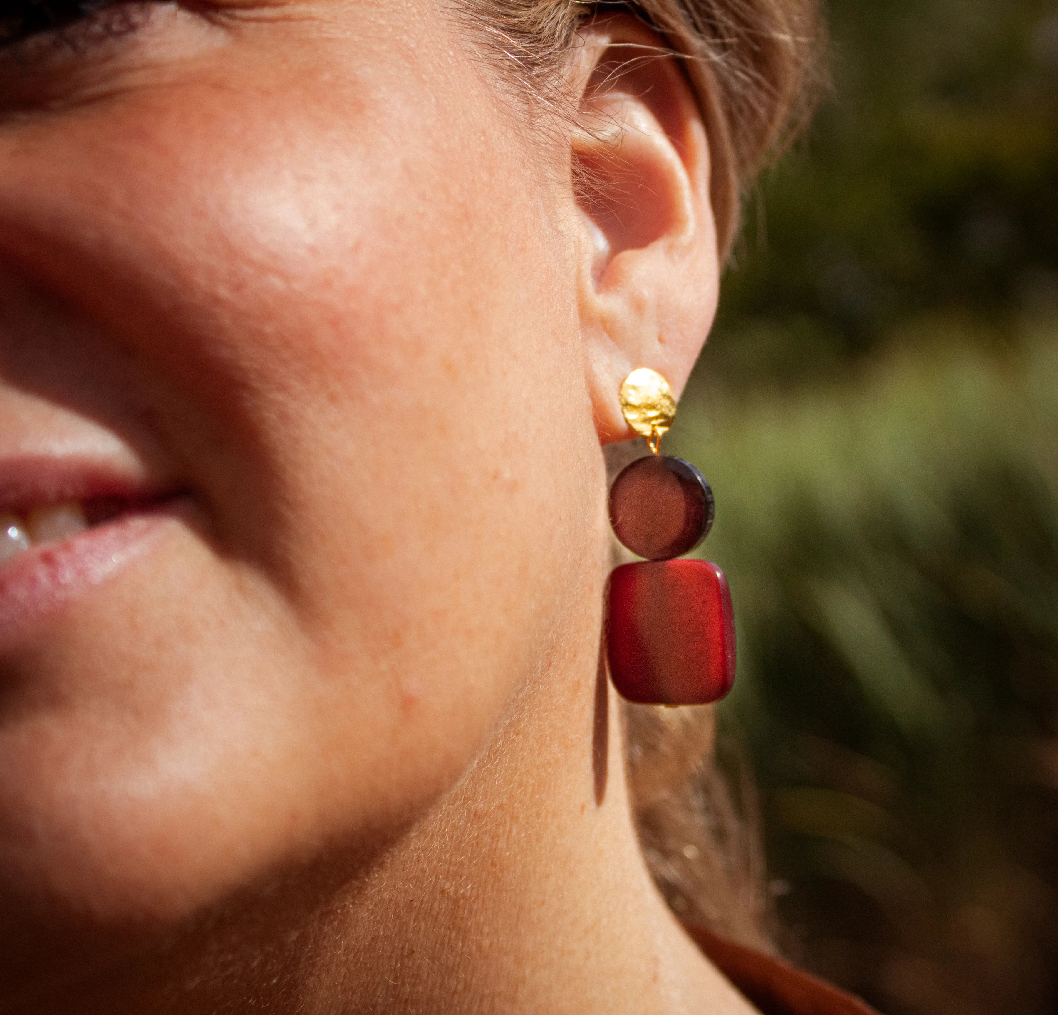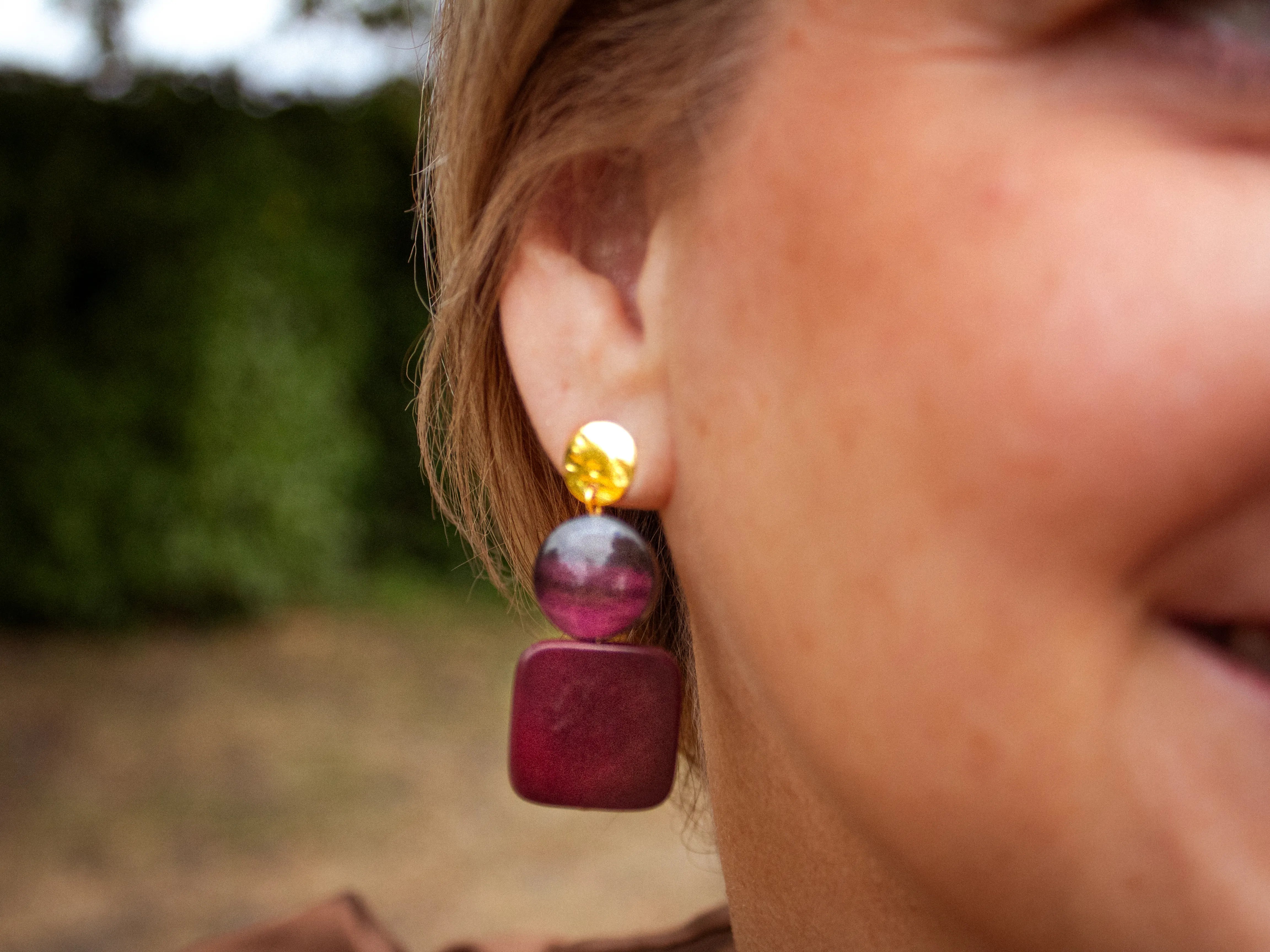 These handmade Belgian earrings pair warm burgundy tones with a softly textured gold-plated stud, creating a refined yet modern statement look. The polished elements catch the light beautifully while remaining pleasantly lightweight. Designed by Noémie, the jewellery designer behind Complimenti, they offer exclusive artisanal craftsmanship — a timeless, elegant choice for lovers of unique, handcrafted jewellery.