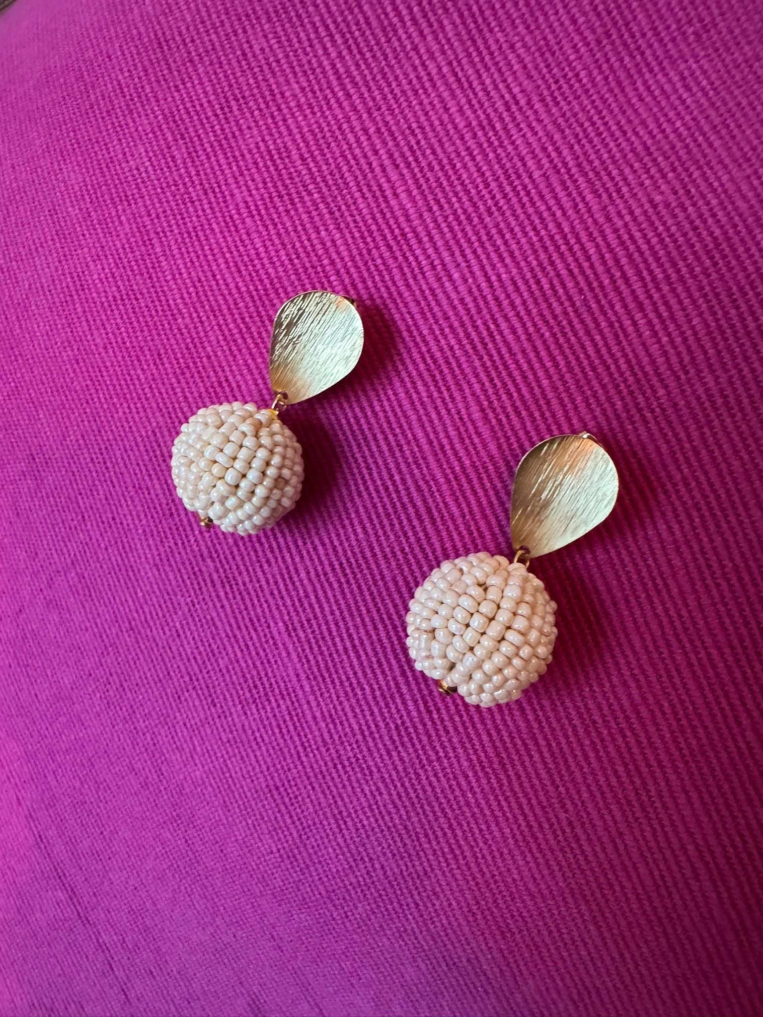 Cream beads earrings combined with high-quality gold-plated brass with a hammered texture.
