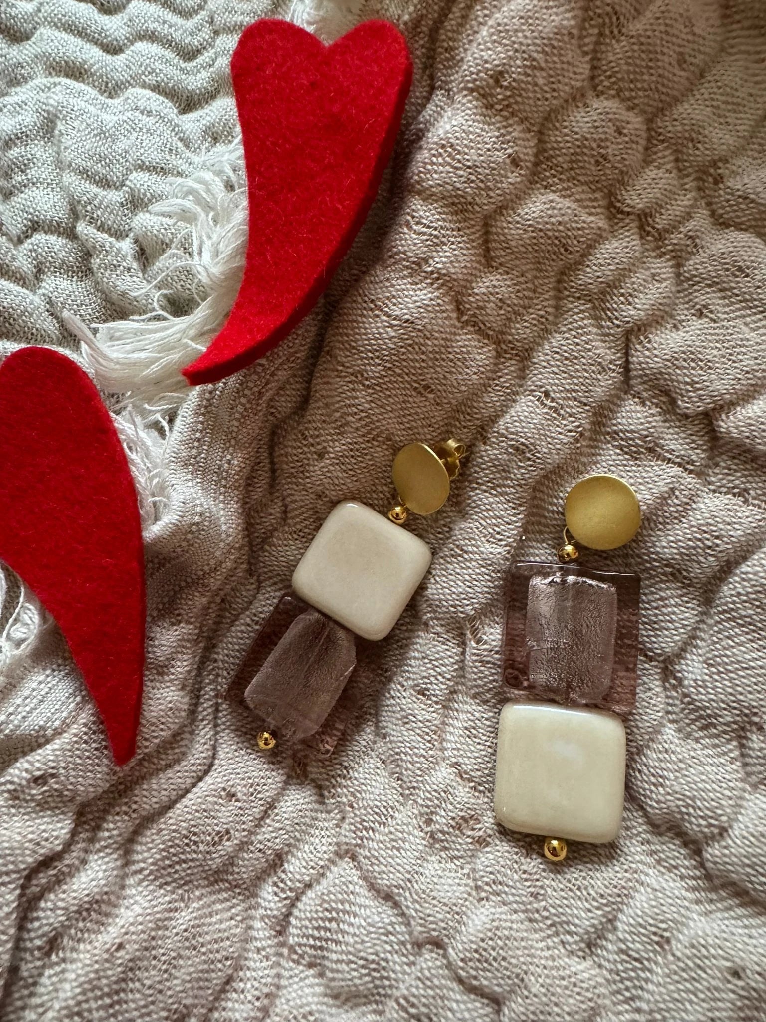 Franca is an elegant blend of vieux-rose and off-white tones. The hand-polished glass elements catch the light beautifully, creating a refined and feminine look. The elongated gold-coloured details add a modern, luxurious touch - a subtle statement that remains wonderfully lightweight to wear. A timeless accessory for any outfit.