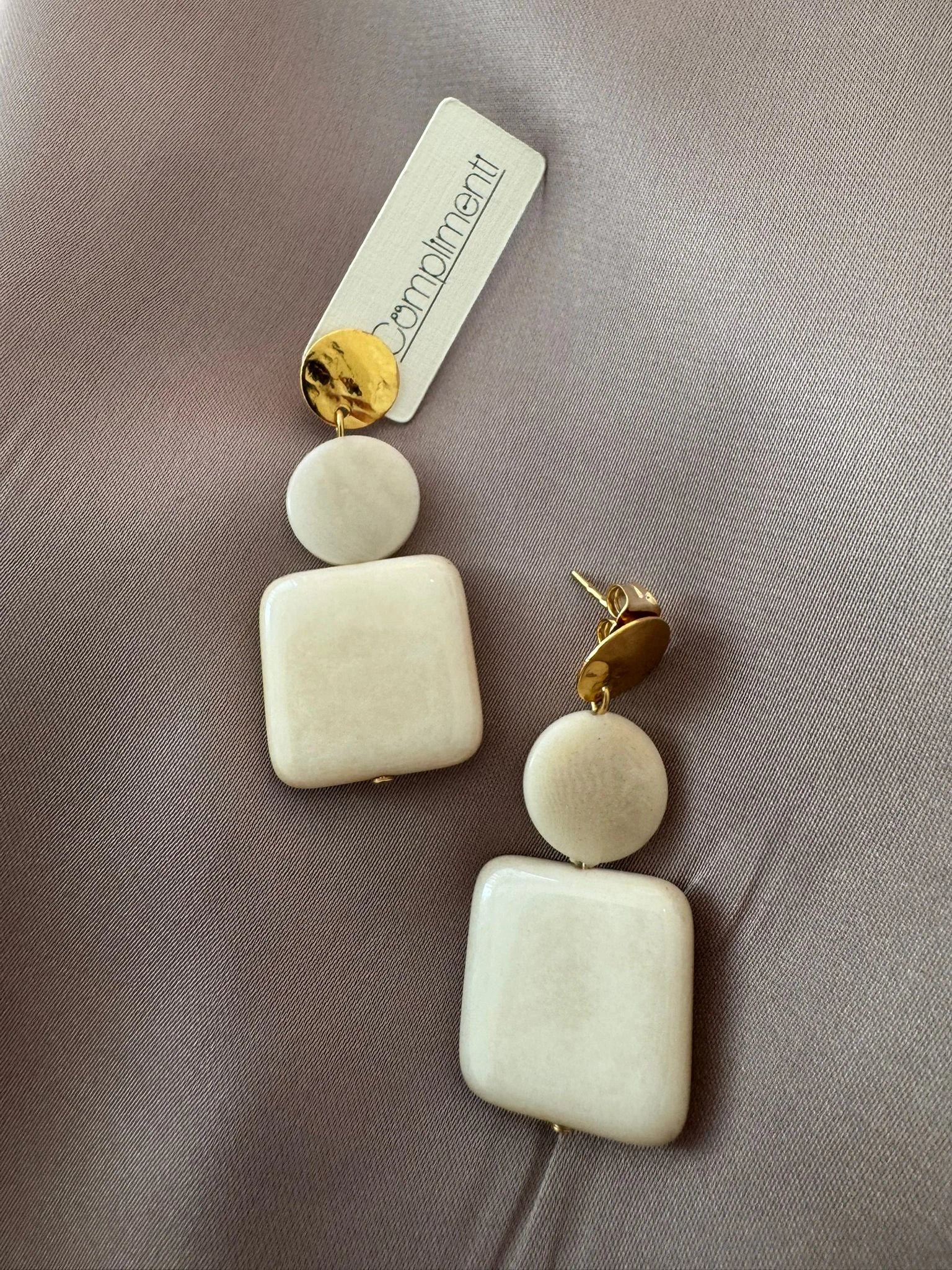 These handmade Belgian earrings in off-white with a softly textured gold-plated stud, creating a refined yet modern statement look while remaining pleasantly lightweight. Designed by Noémie, the jewellery designer behind Complimenti, they offer exclusive artisanal craftsmanship - a timeless, elegant choice for lovers of unique, handcrafted jewellery.
