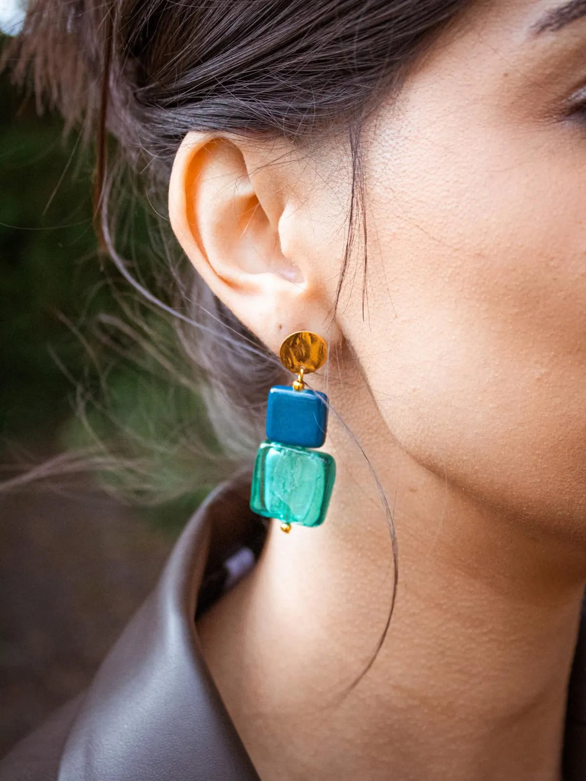 Deze handgemaakte Belgische oorbellen combineren diepblauw en doorschijnend turquoise Venetiaans Muranoglas met een warme vergulde bovenkant. De gepolijste, lichtvangende afwerking creëert een verfijnde maar toch moderne statement look, terwijl ze toch comfortabel licht blijven. Vervaardigd door een Belgische juweelontwerper, bieden ze exclusieve ambachtelijke kwaliteit - een uniek accessoire en een prachtig cadeau voor liefhebbers van elegante, handgemaakte sieraden.